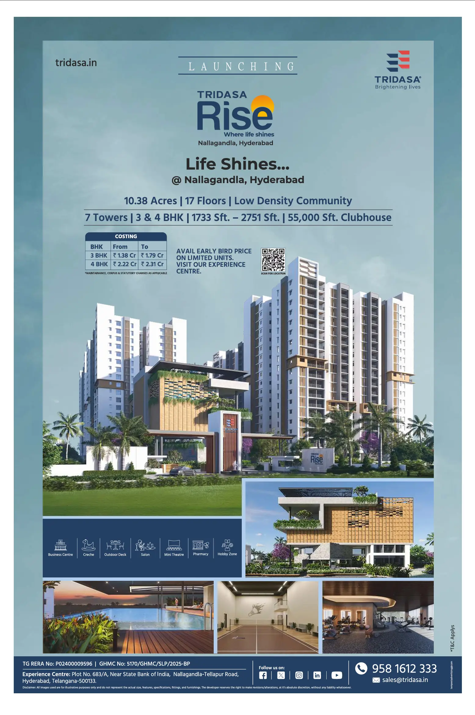 Tridasa Realty Ventures is a new-age real estate brand backed by the Vasudha Group, with a strong focus on empathy, quality, and transparency. The brand’s first venture was Tridasa RISE, a premium residential apartment project in Nallagandla, Hyderabad.